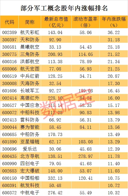 具备国防军工“硬实力”的股票,将获得更多的市场关注。据此,证券时报·从国防军工各个细分领域梳理出相关个股,以飨读者。