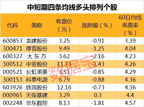 截至最新,446只个股5日、10日、20日、60日四条均线近日呈多头排列。其中龙建股份、厚普股份、大东方股价与60日均线的乖离率最小,分别为3.39%、4.04%、4.23%。