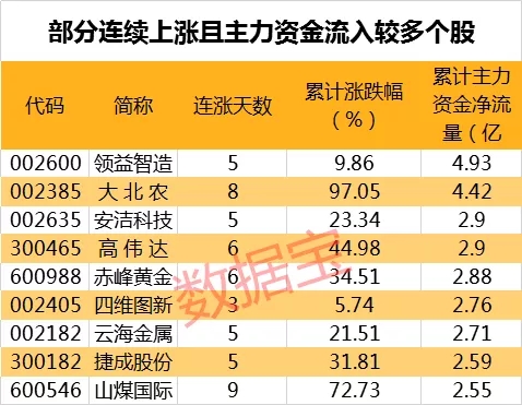 值得注意的是,322只连续上涨个股中,31只个股期间主力资金累计净流入超过亿元。其中,累计资金流入最多的为领益智造,主力资金累计流入4.93亿元。