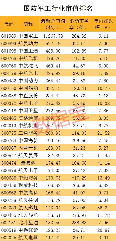 上述的龙头股主要从概念股的市场表现角度进行甄选。另外,还可以从行业市值角度选取部分龙头股。比如国防军工行业的中国重工、航发动力、中国卫通、中航飞机、中航沈飞等个股市值居前,其中大部分股票都是较为纯正的军工股票。