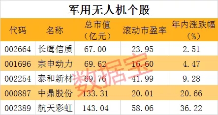 其中,航天彩虹是绝对龙头,年内涨幅超过36%。公司无人机产品主要包括彩虹-3中空多用途无人机系统、彩虹-4中空长航时无人机、彩虹-5中高空长航时无人机等等,且大部分已取得出口立项批复并远销海外,近十年累计销售额位居全球军贸市场前三位。