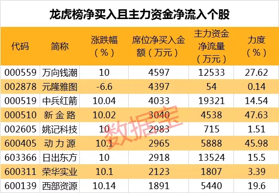 从盘口资金流向来看,主力资金净流入超千万且龙虎榜净买入个股共有14只,其中拓维信息、中兵红箭、日出东方等个股资金净流入金额最大。净流入力度最大的个股有新金路、动力源、退市华业,净流入力度分别为47.63%、45.98%、43.61%。
