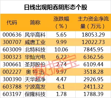 截至1月8日收盘,两市共有15只个股日K线出现阳吞阴形态,当天涨幅最大的是北特科技、威唐工业、奥特迅,涨幅分别为10.06%、9.99%、9.97%。