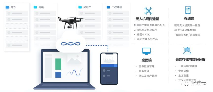 智建云针对企业的诉求,将无人机数据服务带入房地产与建筑工程管理行业中,实现更精细化、智能化的项目管理,搭建自动化、移动端到PC端的无人机数据采集及分析平台,以解决行业痛点问题。