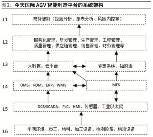 系统架构方案设计是对已经确定的需求做出技术实现的规划。好的系统架构具备可靠性、安全性、可扩展性、可维护性、可定制性等性质。进行 AGV 智能制造平台的系统架构方案设计前,需要确定五个基本需求:一是该平台要与当前企业内部生产管理特点、信息化水平相适应;二是该平台能适应智能制造技术未来发展方向,增加功能或模块时能够顺利接入原有平台;三是该平台具有制造业服务化转型的一些初级功能;四是该平台的对“智能”的落地并非人工智能,而是着力提升系统的柔性和精益性,但保留可接入人工智能技术的扩展性;五是若有外包,系统要最佳适应该组织特点并开放外部 internet 网络接入的接口。根据这五个基本需求,结合对国内智能制造项目系统架构资料的研究,提出AGV 智能制造平台的系统架构如图 2。