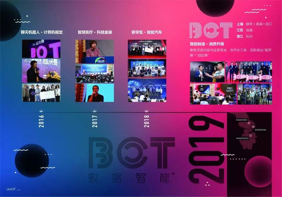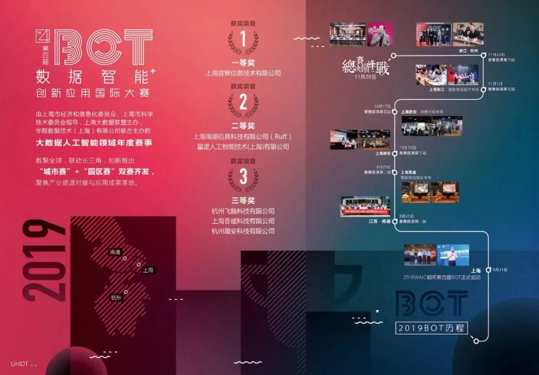 BOT数据智能创新应用国际大赛由上海市经济和信息化委员会、上海市科学技术委员会指导,上海大数据联盟主办。比赛旨在为创新创业团队和资本力量搭建桥梁,创立至今连续举办四届,挖掘和孵化了一批具有发展潜质的优秀项目,并逐渐成为国内数据智能领域的标杆性赛事。未来,将立足长三角地区,逐步走向世界,发挥国际影响力。
