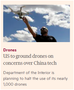 美国政府再对中国产无人机"出手"打压?英国《金融时报》1月13日援引两名消息人士的话称,美国内政部计划永久停飞其最大民用无人机项目之一,该项目拥有近1000架无人机。这家英媒还给出了美方这一计划的理由,仍老调重弹:因为这些设备至少部分是在中国制造,被中国"用于间谍活动的风险太高"。《金融时报》评论说,这是华盛顿对美国使用中国技术"感到担忧"的最新迹象。