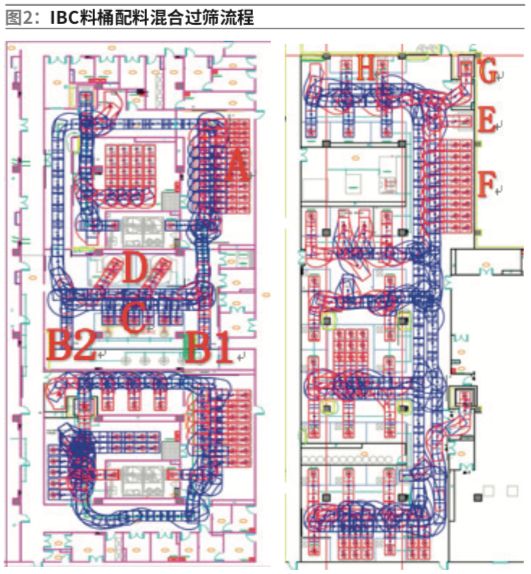 根据作业班次和任务流程管理,AGV在MES的统一调配之下执行固体制剂车间IBC空料桶的周转搬运功能。AGV将A点暂存的空桶搬运至B点进行初始状态下的配料罐装功能。执行完毕后,AGV返回,将A点的IBC空料桶搬运至C点的过筛机,完成过筛初始阶段的准备工作。待B点配料工作完成后,AGV将在B1点已经加料后的满料桶搬运至D点的混合机,进行一步混合功能。一步混合完成后,混合机发出完成信号,通知MES呼叫AGV将混合完成的料桶搬运至C点,进行一步过筛功能。一步过筛完成后,AGV将C点满料桶搬运至B2进行二次配料工作,搬运完成后,AGV返回C点过筛机将留在过筛机上的IBC料桶由卸料位置转换至接料位置。接到B2发出的配料完成信号,MES调配AGV前往B2将IBC料桶搬运至D点进行二步混合工作。在这里我们注意到,在本项目中的第一个亮点即为AGV并不是通过其它周转设备来与混合机对接,而是通过AGV自身的激光定位直接将IBC料桶放在混合机上,实现一步到位的功能。像这样的混合到过筛到配料的工序重复三次,即完成三层的作业功能。IBC料桶配料混合过筛流程,如图2。