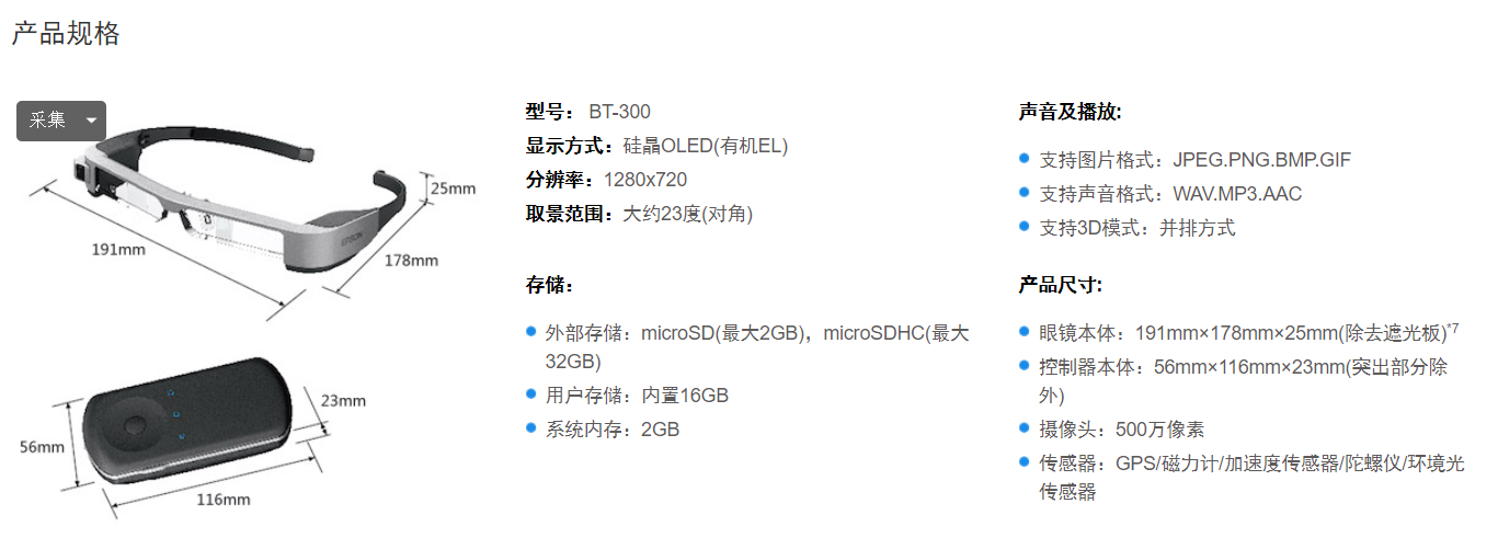 BT-300智能眼镜是一款AR智能眼镜,其实早在2011年爱普生就已经开发出第一代智能眼镜,经过不断地迭代优化,BT-300智能眼镜已经是其第三代产品,并且让无人机成为其优秀的应用案例。得益于硅晶OLED显示设备,新型智能眼镜BT-300显著提高画面的质感,画面显示可达到100,000:1*1的高对比度,相较前代产品有了质的飞跃。硅晶OLED所带来的高对比度和高分辨率(BT-300可以实现1280X720的高清分辨率),使得画面显示可以达到无边框效果,虚拟图像完全融入现实。并且由于面板构造,可改变光导方向,大大缩小镜片和导光板的大小。头部设备仅重69g,长时间佩戴也不易疲劳,随时随地畅快体验。另外,BT-300可达到1677万色的色域,可以更好地还原红色和绿色。