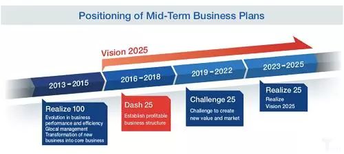 2015年,在安川电机成立100周年庆典上,安川宣布‘2025年长期商业计划愿景’,期望到2025年净销售额实现财年收入在2015财年上翻一番(4113亿日元)或更高;营业收入及营业收入比达到1000亿日元(10%或以上);股息支付率达30%以上(到2020年逐步提高到30%);净资产收益达13%或以上。