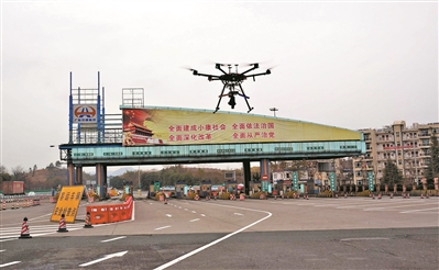 “前方车不要随意变道,注意后方来车!”一阵响亮的喊话声从空中传来,记者抬头一看一架闪着警示灯的大型无人机正在低空盘旋着。