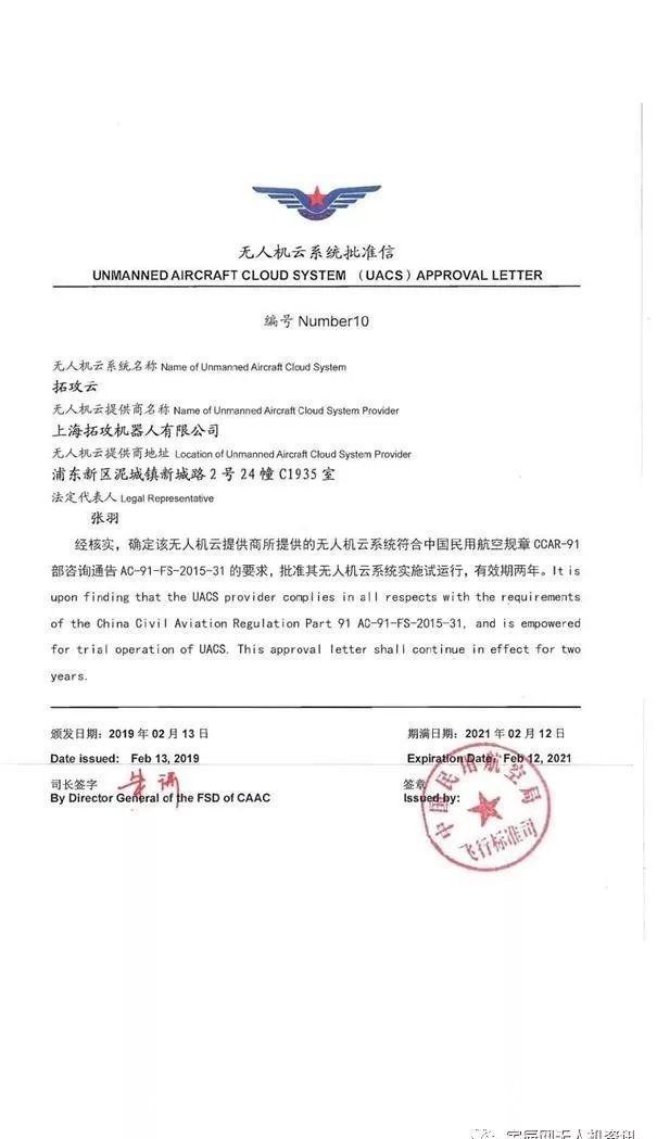2019年2月13日,民航局飞行标准司颁发了第10个《无人机云系统批准信》,批准由上海拓攻机器人有限公司提供的无人机云系统“拓攻云”实施试运行,有效期至2021年2月12日。