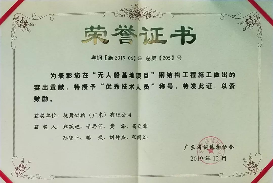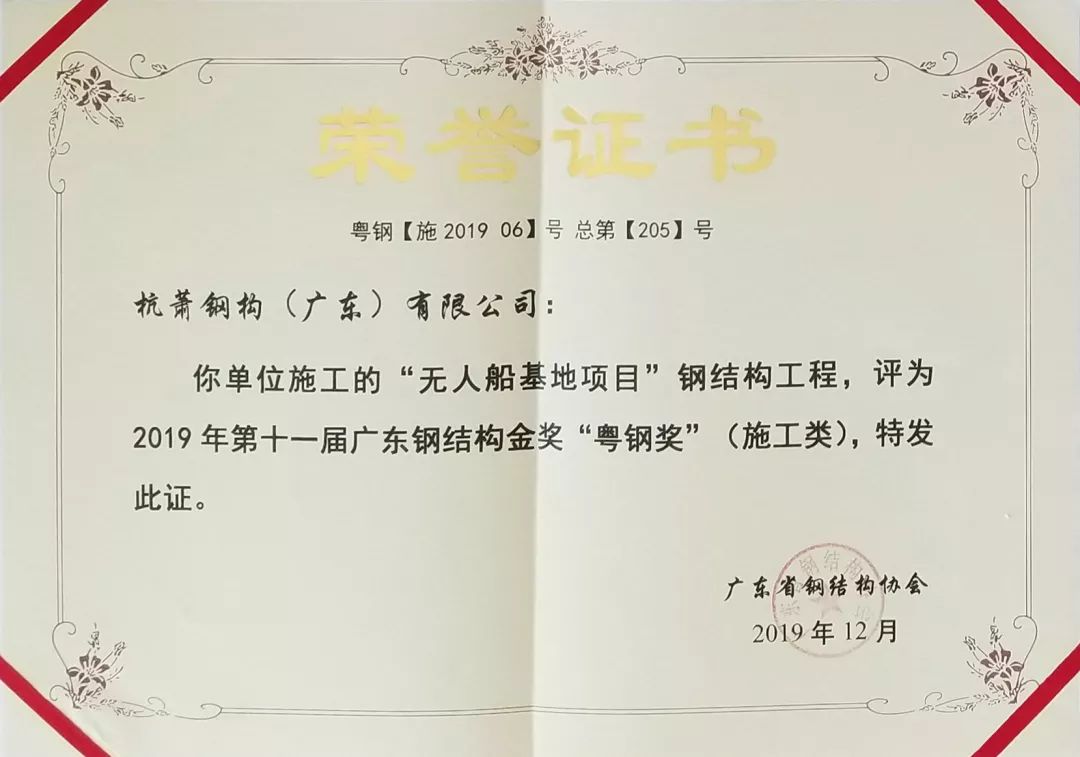 近日,广东省钢结构协会召开了第六届理事会第一次会议。会上,杭萧钢构(广东)有限公司(以下简称“广东杭萧”)承建的珠海无人船基地项目钢结构工程荣获第十一届广东省钢结构金奖“粤钢奖”;广东杭萧游俊被评为2019年度“粤钢奖”工程优秀项目经理;郑跃进、辛思羽、黄添、高天意等8名管理人员被授予“优秀技术人员”荣誉称号。