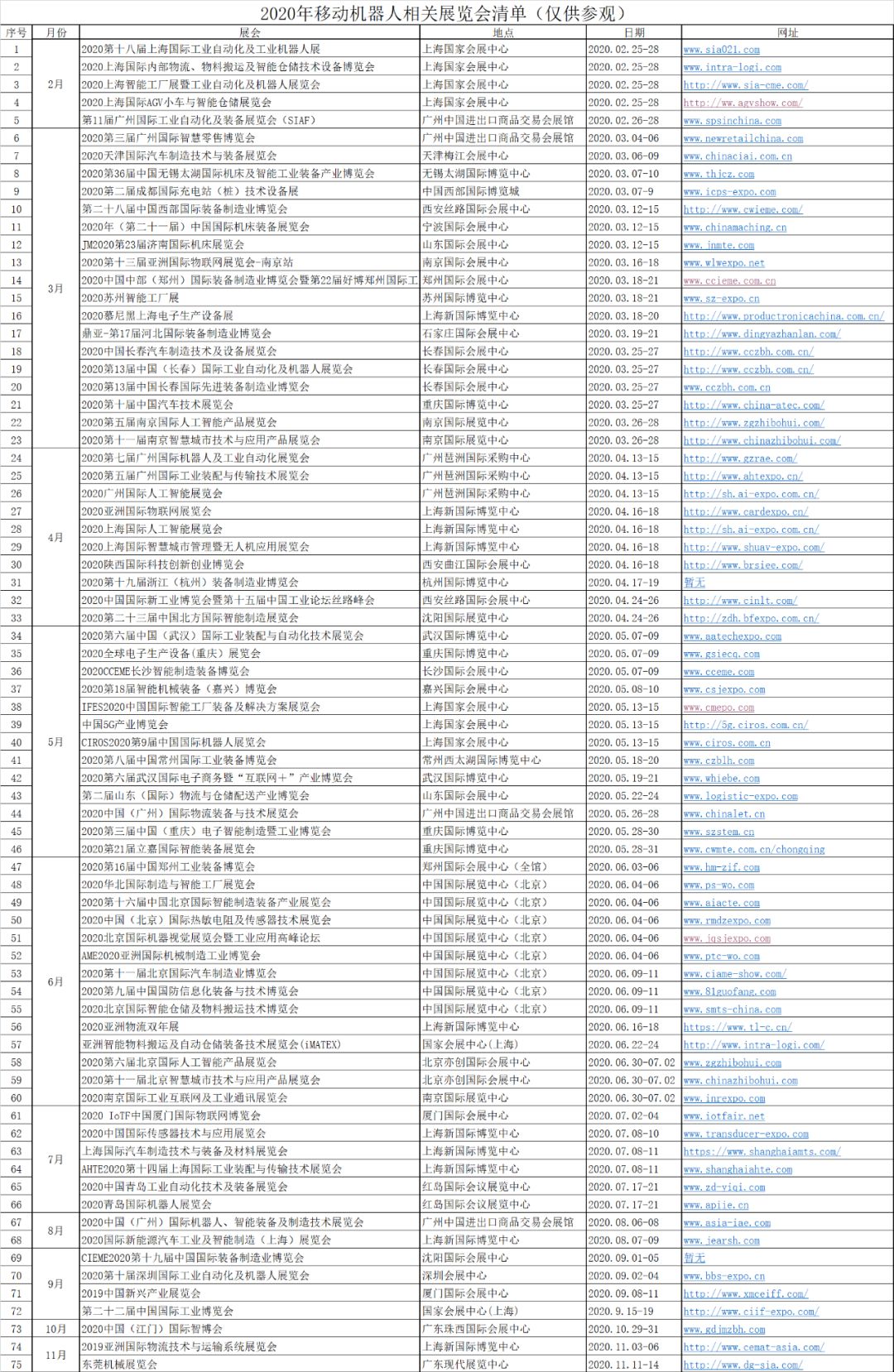 展览会和论坛作为企业拓展市场不可或缺的一个渠道,在2020年开年之初,中国AGV网整理了一份2020年移动机器人行业上下游相关的展会清单(初稿),希望给企业对今年的参展规划有所帮助。说明一下,此处罗列的展会信息大部分来自网络的公开展示信息,难以避免其中有纰漏和变动,具体开展时间以及展会细节以展会发布为准。本清单所罗列的展会包含移动机器人行业以及其应用行业,如您需要更多的展会信息,请登录中国AGV网官网到展会板块查看详情。后面我们也会不定时在微信公众号推介优质展会。