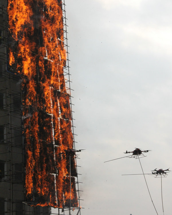 据介绍,这6架高层消防无人机来自大足高新区的重庆国飞通用航空设备制造有限公司,董事长曹兵介绍,这次主要是模拟高层外立面火灾的快速扑救,用了5吨木柴、300公斤煤油和100公斤汽油搭建着火墙面。“木柴在烧至炭化才启动灭火行动,在高燃值的火势下进行灭火,才能验证现代消防装备--高层消防无人机的灭火能力。”曹兵说,公司从事大型油动变距多旋翼无人机和工业级电动无人机研发,已研发出国内多款高层消防无人机。