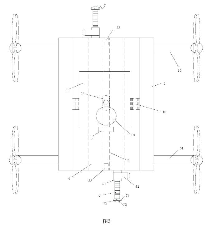 该发明无人机本体左右两侧均开设有槽道,无人机的机翼能转动设置在槽道内,这样无人机不使用时机翼能折叠收起,减少了无人机战胜的空间;且该发明在一方形筒体内设置有微型摄像头和双向激光测距仪,方形筒体左右两侧均固定有一方形框体,且该方形筒体和方形框体在转动电机的驱动下能在通道内进行左右移动;这样无人机在进行测量的时候,先通过微型摄像头查看电梯导轨支架的位置,然后驱动方形筒体进行移动到电梯导轨支架的位置后,双向激光测距仪再进行测距;而方形框体内均设置有一横杆,横杆的顶端设置有一标记机构,在双向激光测距仪测量到导轨支架间距大于2.5米时进行标记,该标记采用墨水,这样检验员下次就知道哪里的导轨支架有问题,告知安装人员方便其对超标准间距的导轨支架纠错整改,提高了工作效率,有效减轻检验员的劳动强度,且保证了检验员的人身安全。