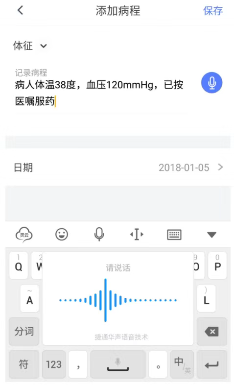 智能病例书写——通过灵云智声,医务工作者大量的文字记录工作可以通过说话的方式完成,提高工作效率,节省医疗资源。