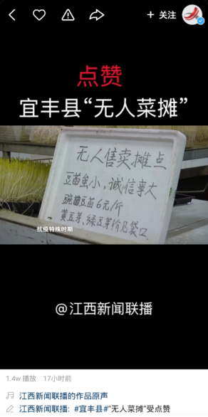 在湖北罗田、江西宜丰、山东青岛等地,大伙儿为了减少不必要接触,在菜摊上推出了“无人售卖”模式。蔬菜被分袋装好,标注价格,扫一扫二维码,轻松支付,无需找零。(友情提示:请大家自觉付款啊)