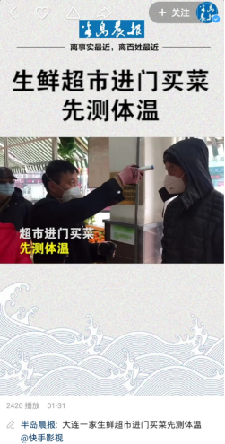 于是,部分菜场,推出了进门先量体温的办法。辽宁大连,一家生鲜超市门口,所有顾客进门买菜钱,都得先测量体温。虽然因此大伙得排好久队,但非常时期,大家都自觉遵守,互相理解!