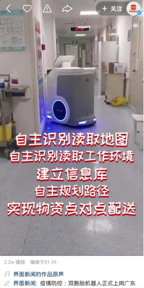 据说,一个机器人,相当于3个配送员的工作,大大降低了医护人员的感染风险。