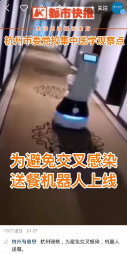 在浙江宁波、嘉兴、杭州等一些集中隔离点,更霸气,直接派机器人送餐。既避免了交叉感染,又节省了人力成本。