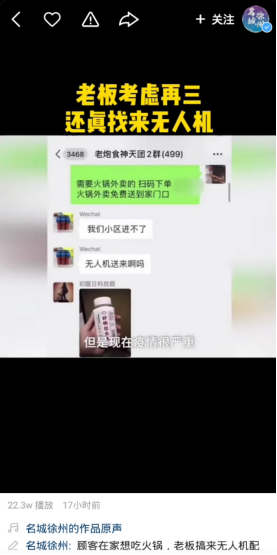 业主出不来,但火锅可以进去啊。于是,老板调来了一架无人机,为住户们“空运”送火锅!