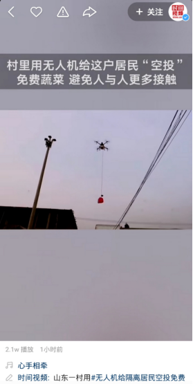 据@时间视频快手号报道,当地有一户居民,从武汉返乡后居家隔离。村干部为减少人员接触,于是派出无人机,给这户人家免费“空投”方便面和蔬菜。