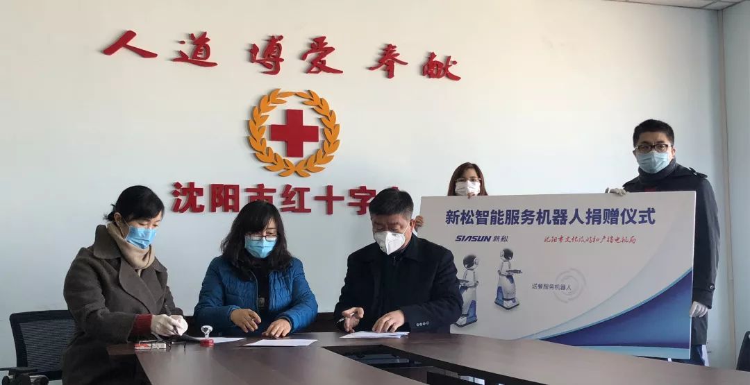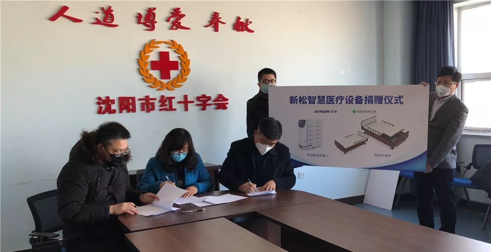 ▲2月5日,捐赠仪式在沈阳市红十字会举办,医大一院副院长、工会主席滕伟禹,沈阳市文化旅游和广播电视局副局长马今,新松公司副总裁王玉山,沈阳市红十字会副会长孟丽君共同签字