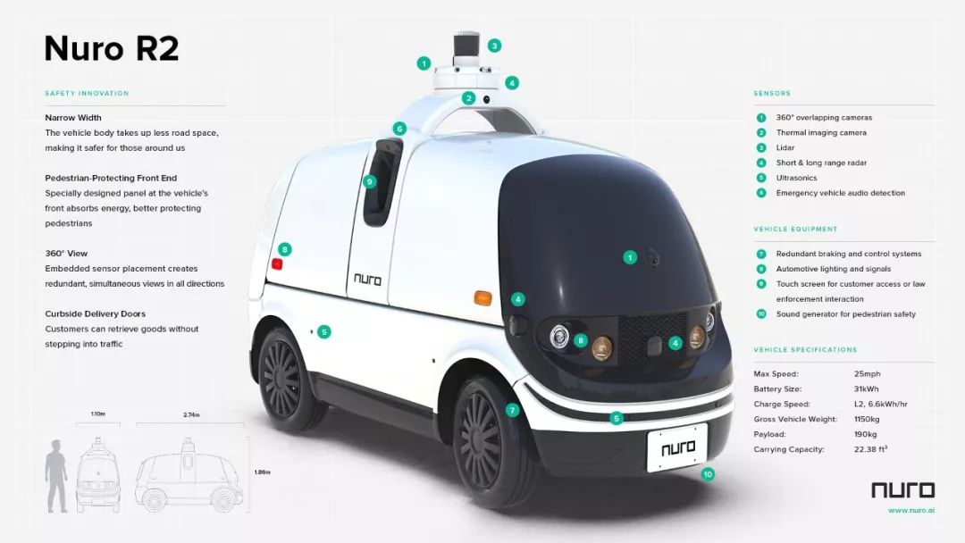 2018年1月,Nuro推出了自主研发的自动驾驶汽车R1,根据官方给出的信息,这款车的车体尺寸约为普通轿车的1/3 ~1/2大小,车身两侧均是可以打开的货仓。车辆顶部架设有一台16线或32线激光雷达,而围绕车顶和车身一周,布置了8个或以上的摄像头。车身结构和材料的设计主要是为了保护周围的行人。