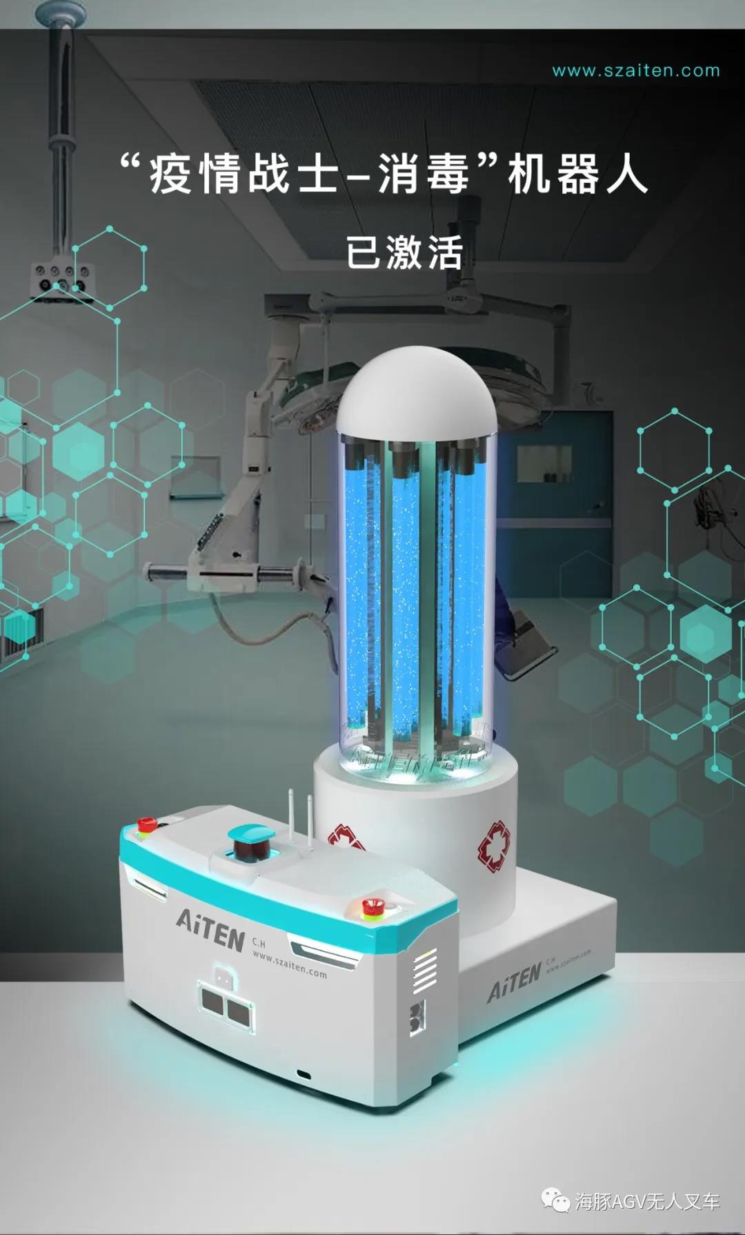 从图中我们可以看出,这款“消毒小能手”基于“小海豚家族”机器人为原型,将叉腿部分改装成了可以装载紫外线等消毒设备的平台。通过调度等控制系统进行无人化操作,可以有效代替人工对厂房等区域进行全面、高效、彻底消毒。