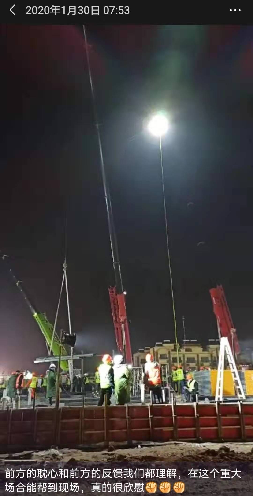 图片上我们可以看到多台系留照明无人机为施工现场提供夜间照明。冬季的夜晚虽然寒冷,在加上连续的加班疲惫不堪,但是大家的热情如同灯光一样通宵达旦彻夜不休,为抗争疫情进行到底。