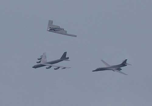 同框的B-1B、B-52H和B-2战略轰炸机