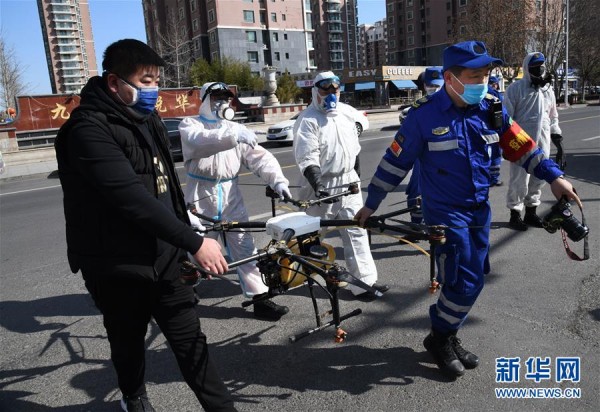 2月5日,一架无人机在青岛西海岸新区一小区准备起飞,进行空中消杀作业。 当日,青岛市借助无人机配合地面防疫人员,对高密度居民小区进行空中防控消毒作业。据介绍,一架普通植保无人机每次可携带10公斤左右消毒液,单次喷洒面积可覆盖5000平方米。 新华社记者 李紫恒 摄