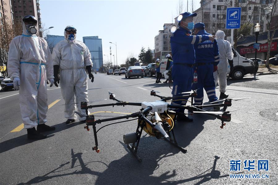 2月5日,工作人员在青岛西海岸新区一小区外操作、监控无人机。 当日,青岛市借助无人机配合地面防疫人员,对高密度居民小区进行空中防控消毒作业。据介绍,一架普通植保无人机每次可携带10公斤左右消毒液,单次喷洒面积可覆盖5000平方米。 新华社记者 李紫恒 摄