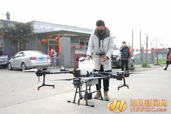 1月30日上午9点,五里墩村29岁小伙刘帅赶到了村委会,按照计划,今天他将操作无人机继续为2个村民小组喷洒消毒药水。与村里工作人员一起到达指定地点,安装无人机、装上兑好的消毒水,一切准备就绪,随着轰鸣声,无人机缓缓起飞,徘徊在村民聚居点上空,消毒液如蒙蒙细雨班均匀地喷洒下来。