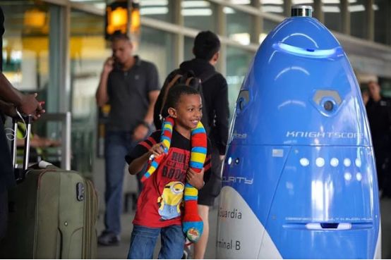 值得注意的是,许多机场已添加了机器人来作为安全人员,以扫描威胁并检测武器。例如,一种新型安保机器人开始在纽约三大机场之一的拉瓜迪亚机场上岗巡逻。这个新来的安全卫士是由Knightscope公司生产的K5型机器人。