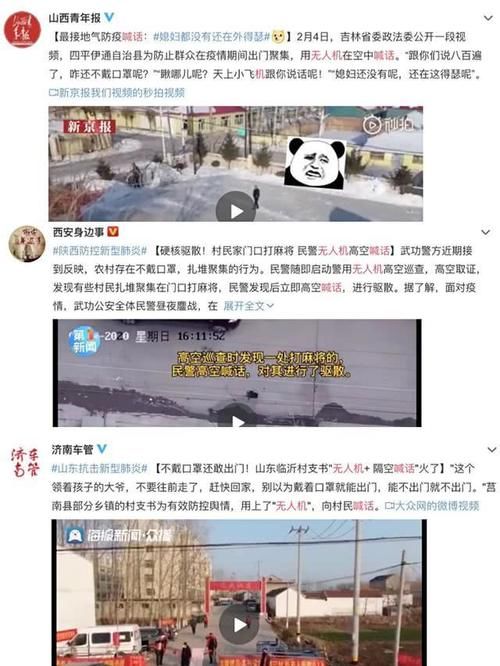 而且硬核喊话的无人机不仅仅出现在江苏街头,只要网上一搜一大把,从四平伊通自治县最接地气防疫喊话,到武功警方村民家门口高空喊话驱散打麻将,再到山东临沂村支书用无人机隔空喊话,有效防控舆情,可谓物尽其用,费尽心思。