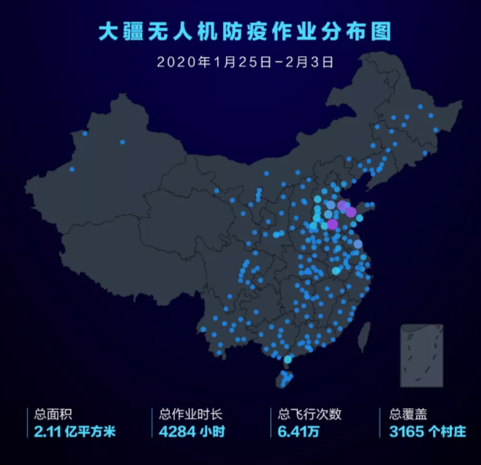 为响应国家的号召,积极履行企业社会责任,DJI 大疆农业现正式发布「疆军战疫」行动,设立 1000 万基金支持各地战疫先锋,并将发布消杀指南等,助力安全防疫。DJI 大疆农业各地飞手与合作伙伴主动请缨,使用植保无人机支持各地抗击疫情。河南宝丰、成都崇州、山东聊城、湖南常德等地的大疆农业植保队纷纷行动,为村庄及主要街道口喷洒消毒液剂,协助当地消杀防疫。