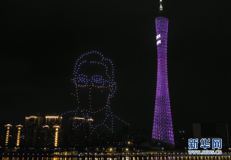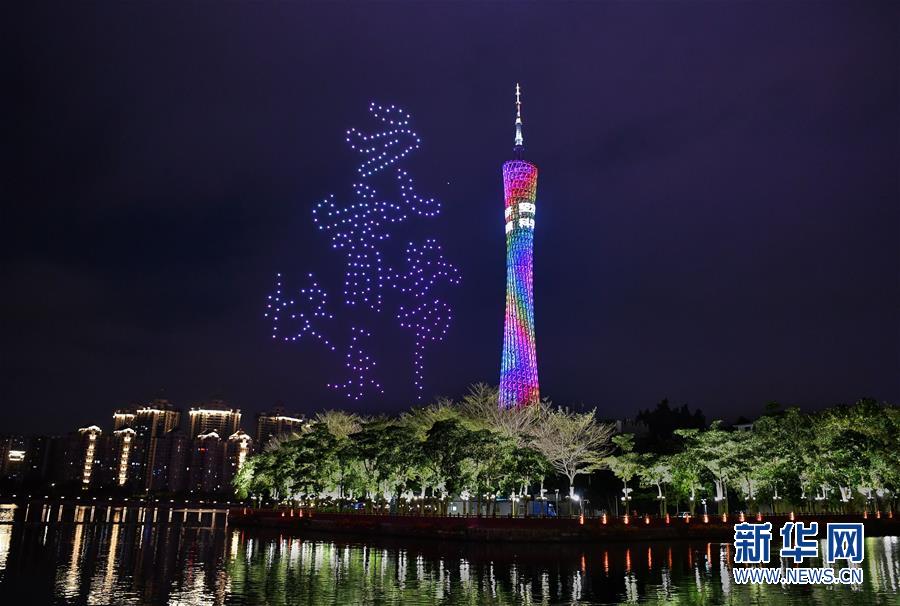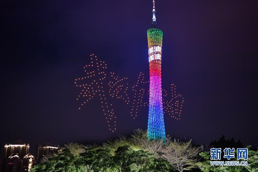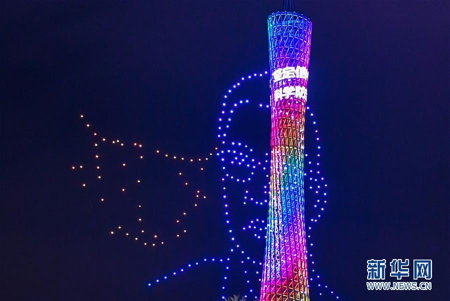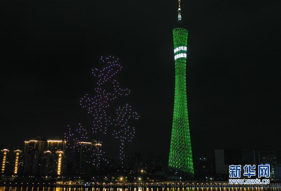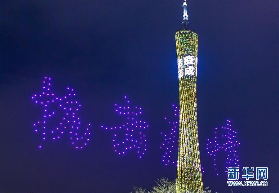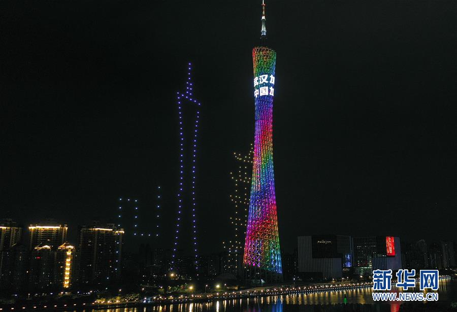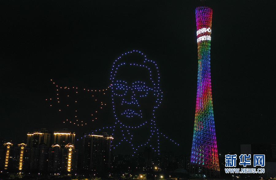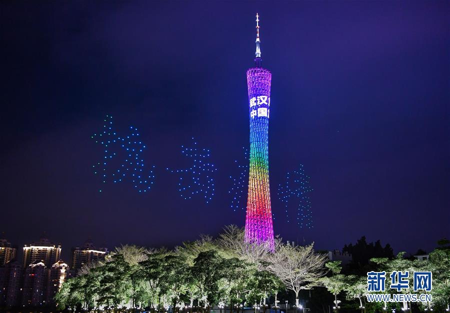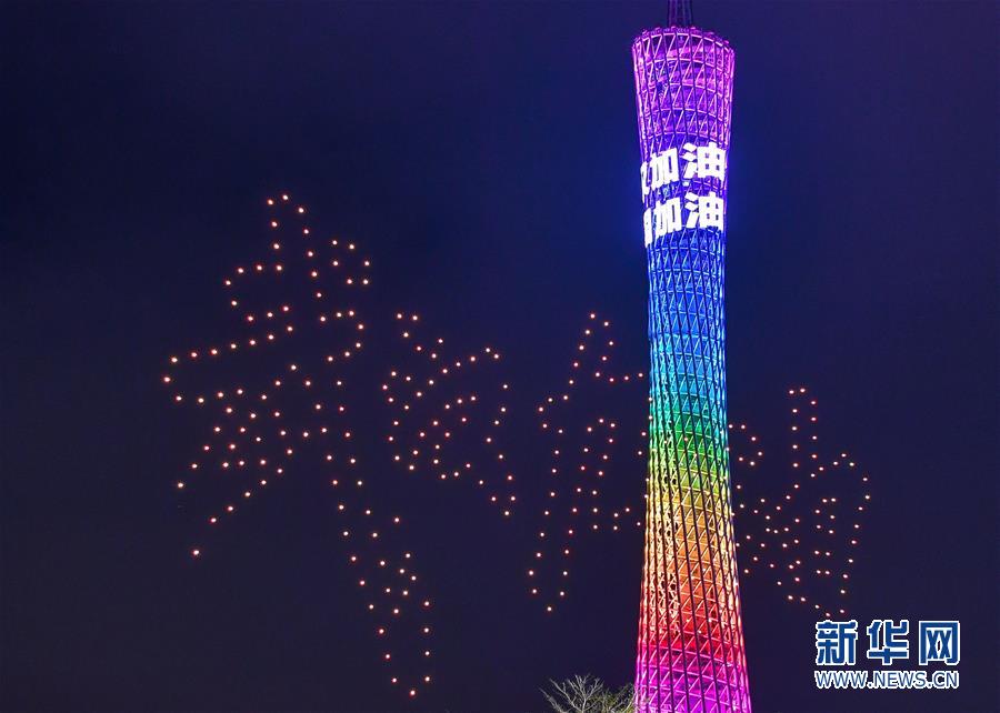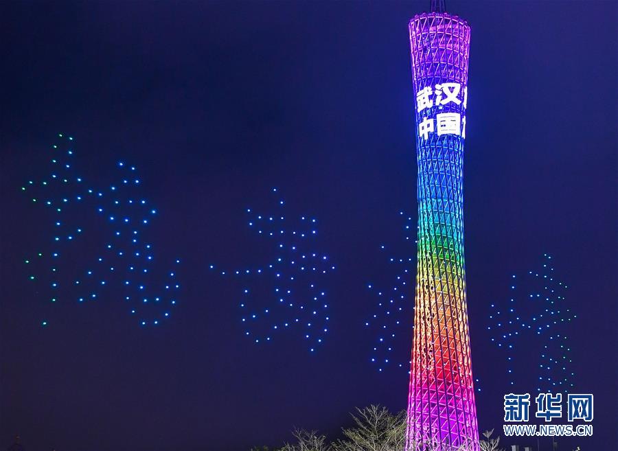2月9日凌晨,广州珠江上空的无人机编队组成“抗击疫情”字样。9日凌晨,广州亿航白鹭无人机编队在珠江上空拼出“众志成城 抗击疫情”、“武汉加油”、“元宵节快乐”字样以及广州塔和黄鹤楼图形、戴好口罩图形,以此为武汉加油。 新华社记者 刘大伟摄