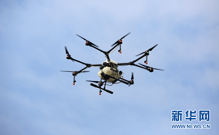 2月4日,黄山市山越应急救援中心的队员在公共区域用无人机喷洒消毒液。