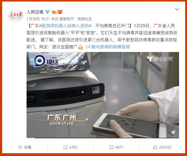 比如广东省人民医院的两台无人驾驶机器人。它们在医院中承担着送药、送餐、回收被服和医疗垃圾等工作,大大降低了医护工作人员交叉感染的风险。