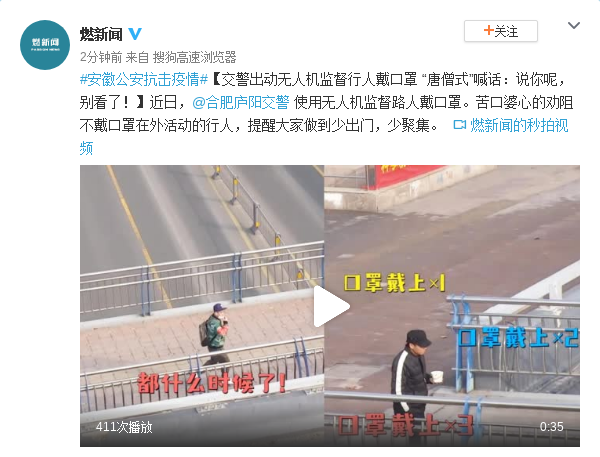 近日,@合肥庐阳交警 使用无人机监督路人戴口罩。苦口婆心的劝阻不戴口罩在外活动的行人,提醒大家做到少出门,少聚集。