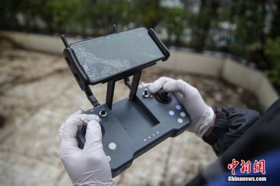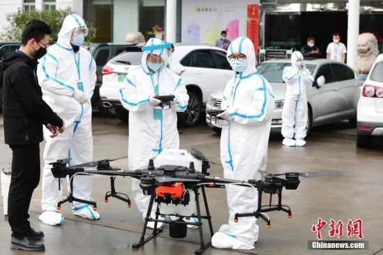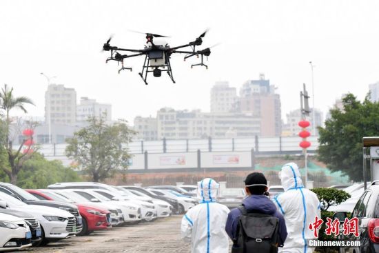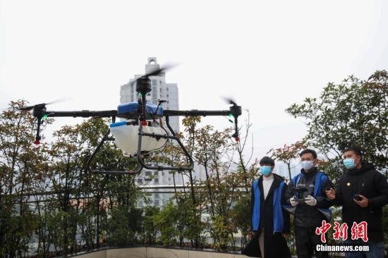 2月11日,工作人员操控无人机进行防疫消杀作业。中新社记者 瞿宏伦 摄