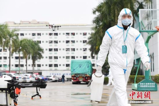 2月11日,深圳市工业信息化局“青年突击队”、大疆消杀志愿服务队利用植保无人机在深圳市稳健工业园展开消杀作业。连日来,该服务队对深圳工业园区、学校、垃圾填埋场等场所进行了防疫消杀。中新社记者 陈文 摄
