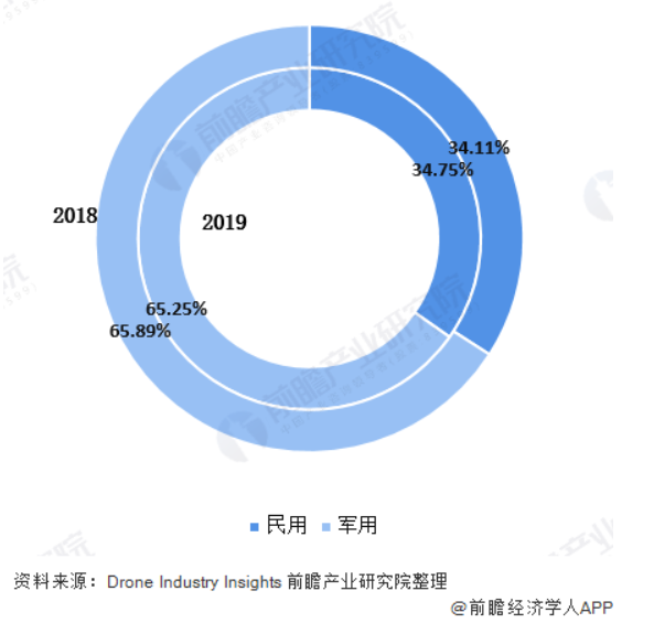 Drone Industry Insights 数据显示,2019 年全球无人机市场规模为 259 亿美元,其中军用领域 169 亿美元,占比为 65.25%;民用为 90 亿美元,占比为 34.75%,同比增速连续两年超过 20%,增速高于军用市场。
