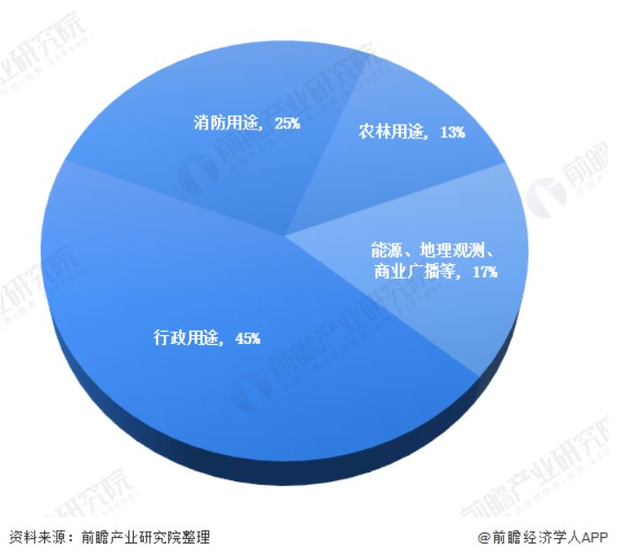 目前来看,民用无人机最大的市场在于行政服务的提供,占比高达 45%,其次消防用途占比为 25%,农林植保占比达 13%,其余的能源、地理观测、商业广播等用途占比约为 17%。