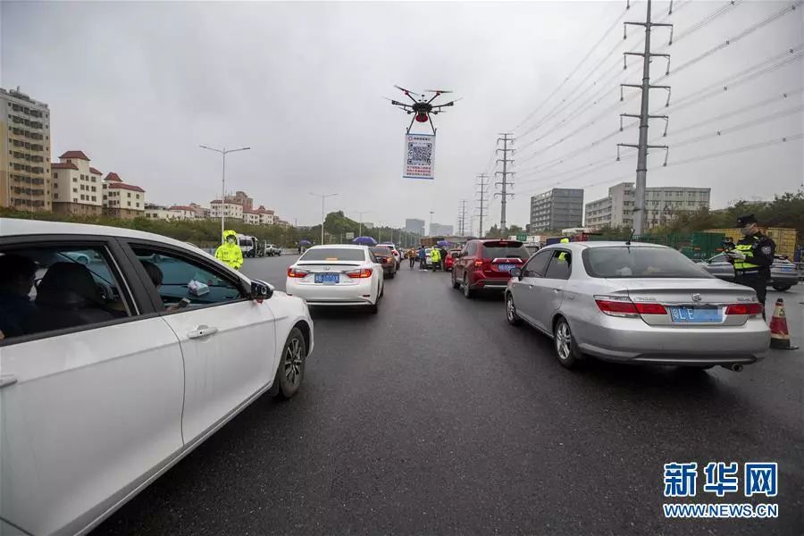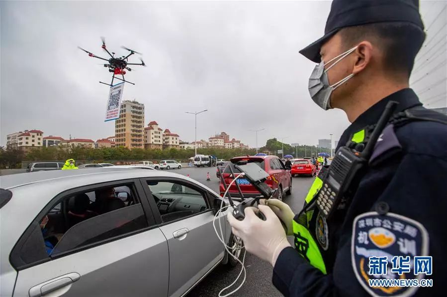 随着返深车辆和人员的增加,深圳从8日开始启用线上车辆申报登记。为提高申报效率,搭载喊话器、悬挂申报二维码的无人机成为防疫一线工作人员的得力助手。民警操作无人机在车辆队伍中穿梭,并通过喊话器提醒驾乘人员扫码登记,减少人员接触的同时提高了效率。新华社发(赖犁摄)