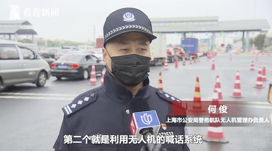 上海市公安局警务航队无人机管理办负责人何俊:“一个是实时将道路信息传递给指挥中心,第二个就是利用无人机的喊话系统告知所有的驾驶员同志提前扫码,填写个人信息。”