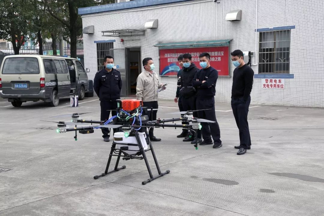 图:华科尔工作人员为民警介绍无人机在防疫中的作用