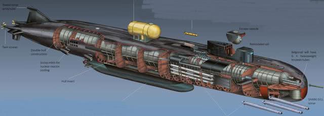 “别尔哥罗德”号潜艇是俄罗斯最新研发的一艘核潜艇,也是目前世界上最大的一艘核潜艇。它的出现象征着俄罗斯海军的装备水平又向前迈出了一大步,进一步提升了俄罗斯的国防实力。据了解,该核潜艇的原型是俄军之前的一艘导弹核潜艇,它在改装中拆除了 “花岗岩”导弹发射系统,重新设计为一个30米长的用于携带深潜器的舱段。同时,设计中还考虑到了潜水员作业需要,配备了平衡压力舱,以便他们可以在深水地区完成出入。